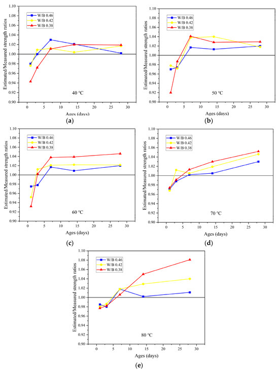 - With an increase in the W/B ratio, the correlation of the fitting curve of the MRC equivalent age–compressive strength relationship model gradually worsened but still had a good correlation (R2 greater than 0.93). The model underestimates early strength and overestimates late strength. Except at 80 °C, the deviation between the measured and estimated values was within 5%, indicating good applicability of the model.