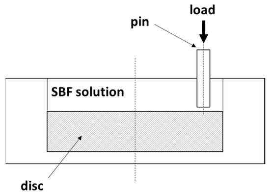 Tribological studies were carried out using a UMT TriboLab tribometer (Bruker, Billerica, MA, USA), with a pin-on-disc system in a simulated body fluid (SBF) solution (Figure 1). The duration of each measurement was 3600 s at room temperature (RT). Each measurement was repeated three times. Abrasion resistance was tested with the following parameters: normal force (Fn) = 5 N, frequency (f) = 1 Hz. The tested material was used for the pin. The counter sample was a 316LV stainless steel disc.