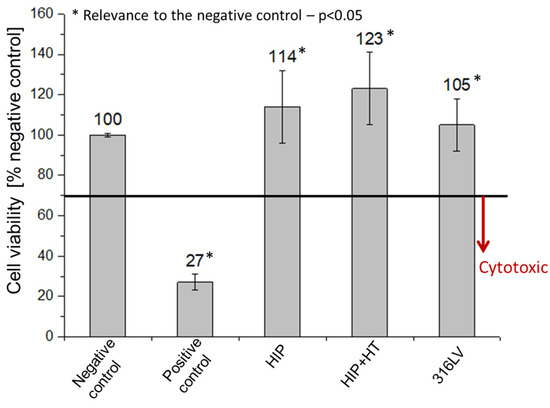 ATCC® HTB-85TM (human osteosarcoma cell line) was cultured on the nickel-free stainless steel samples obtained via HIP and HIP + HT and, for comparison, on 316LV stainless steel. The cell proliferation was assessed after 48 h for all the tested materials. The cell viability was assessed using cell viability graph analysis, and the results were compared with the control. Figure 4 shows the comparative results, indicating that proliferation increased in all materials tested compared to the control. The HIP + HT sample showed the highest cell proliferation, indicating the highest antibacterial properties among all the tested materials. These results indicate that all tested materials are non-cytotoxic, in accordance with the International Standards EN ISO 10993-5, and the cell viability did not fall below 100% of the negative control value.