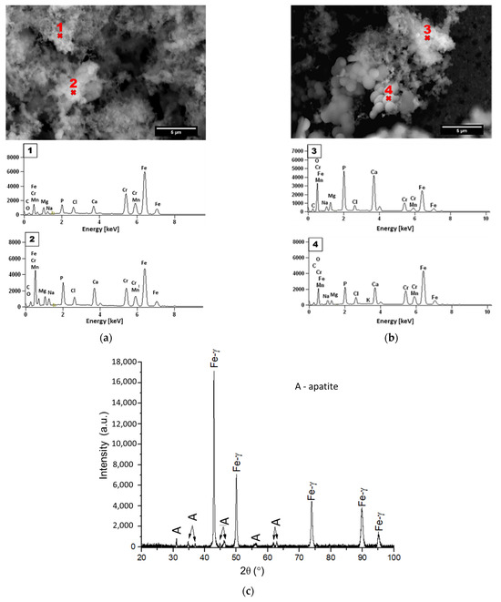 The SEM morphology of the samples surface after 7 days of immersion in the SBF solution is shown in Figure 5. It was observed that the apatite had grown on the surface of all tested samples. However, on the surface of the HIP + HT nickel-free stainless steel, the apatite is visible on the entire surface (Figure 5a), while areas with a lower apatite concentration were detected on the surface of the HIP stainless steel, as shown in Figure 5b. The irregular distribution of appetite on the surface of the tested materials indicates the gradual deposition of hydroxyapatite (HA) on the surface of stainless steel.