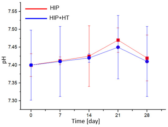 Tissue fluids circulate constantly in the human body, so it can be assumed that a more appropriate method for testing bioactivity is the approach with regular replacement of the SBF solution. In Figure 8, it can be seen that the changes in the pH of the solutions of all tested materials are similar; the pH increases up to 21 days of incubation, and then decreases. It may be related to phosphate groups and calcium ions being adsorbed and deposited on the steel surface in the form of calcium-phosphate compounds. This stage of apatite formation lowers the pH in the SBF solution [25].