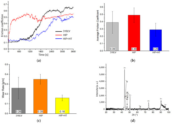 Figure 9d shows the X-ray diffractogram of the HIP + HT material after tribological testing. It should be noted that after testing, martensite (α’) is observed on the surface of the HIP + HT sample, probably due to the strain-induced martensitic transformation of austenitic stainless steels caused by excessive plastic deformation [29]. Interestingly, this transformation was not observed for the as-HIP sample. The γ to α’ phase transformation may be responsible for the lowest values for the friction coefficient and wear rate of the HIP + HT sample, as it gradually strengthened the surface of the material during friction. Also, complex and hard FeCr3N precipitations, detected via XRD, which were formed during the friction process as a result of the reaction of nitrogen dissolved in the steel matrix with chromium and iron, can improve the tribological properties of the HIP + HT steel sample.