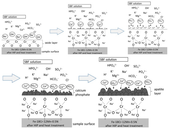 The changes in the pH of the SBF solution observed during the bioactivity tests of the HIP + HT nickel-free stainless steel may be caused by the adsorption of Ca2+ and PO43− ions (Figure 8). Ca2+ and PO43− ions, after being deposited on the material surface, enhance nucleation and gradual crystallisation in apatite. The ability to form apatite depends on many factors, one of which is the presence of phosphate groups in the solution, which occur mainly at a pH above 7.2 [22].