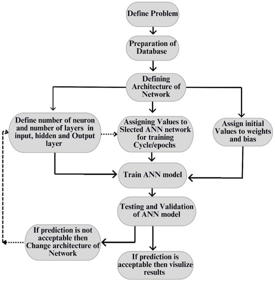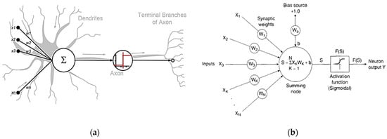 Artificial Neural Networks (ANNs) show their operational similarity to the biological counterparts present in human and animal Brain and Central Nervous Systems (CNSs). ANNs are designed to perform functions, such as processing information, learning from it, recognising patterns, and predicting outcomes, similarly to how the biological nervous system functions in living organisms. By mimicking the human brain’s basic operations, ANNs can solve complex problems, and they have numerous applications in natural language processing, image reading, and data prediction (see Figure 1a for reference) [15,16,17]. The structure of an ANN is a multilayer structure (input layer, hidden layer, and output layer) with interconnected neurons; a specific weight coefficient is assigned to links between neurons. As input values from neurons are evaluated and then multiplied with the weight coefficient, these values from all neurons in each layer are summed with a biases value. This procedure is repeated for each successive layer of the ANN model, creating a system of interconnected layers and neurons that work together to process and transmit information (see Figure 1b for reference) [18,19,20]. As soon as results are obtained after the summation of bias value from all of the neurons, a predetermined activation function (f), which represents the relationship between the neurons in consecutive layers, is applied. The output from this process of the last neuron of the previous layer is used as input for the next layer neuron (as shown in Figure 1). Initially random, weights are assigned between links; later on, during the training process of the network, multiple iterations are performed to adjust the values of weights to obtain a final value to justify the output prediction based on the input database. Equations (1) and (2) provide an analytical expression for the summation of weights [21].
