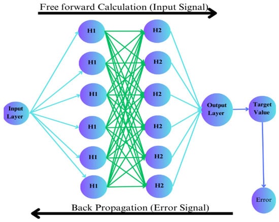 On behalf of this error signal, the next phase of MBNN is started, where the error signal is used for back calculation to adjust the values of weights and biases that were initially applied randomly; this is achieved by taking the derivative of the activation function, and then the architecture of the network is changed; for instance, the number of neurons in each layer or the number of layers is changed, and the number of cycles is also increased. Then, the feedforward process is repeated until errors are minimised and the network is optimised for precise results [21]. This process is carried out through the “Gradient Descent” method. The change in weight values depends on the error function “E” and the learning rate “η” applied [16]. This correction is calculated from Equation (4).