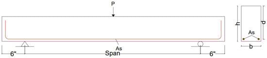 In total, 110 sample databases were included in this network training, testing, and validation process. Data were based on a simply supported rectangular beam without shear reinforcement (as shown in Figure 3), for which the sampling was performed in the UET Taxila concrete laboratory under the supervision of Prof. Dr. Ayub Elahi [25]. The ranges of the database are listed in the Table 2 below. The experimental results calculation procedure is explained in Appendix A.