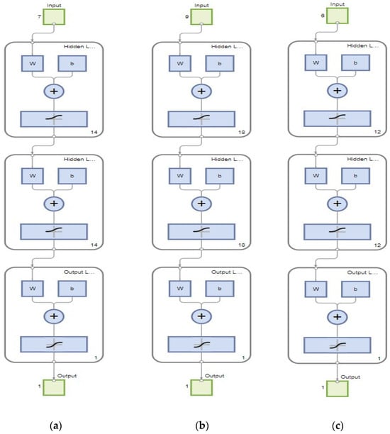 (a) Artificial Neural Network diagram for first crack load, (b) Artificial Neural Network diagram for flexural strength, (c) Artificial Neural Network diagram for shear strength.