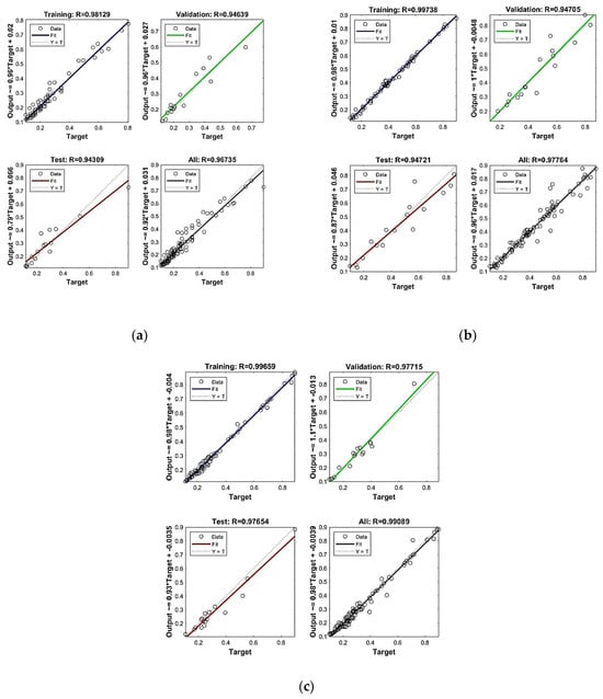 Regression analysis results (as shown in Table 5) for the first crack load, flexural strength, and shear strength model are listed in Figure 6; they show optimised regression values, like for the first crack load, which gives R = 0.981 for training. In contrast, for all (training, testing, and validation combined), R = 0.967, which is close to 1 and means that the predicted results are more concise. Similarly, flexural strength gives R = 0.997 for training. In contrast, for all (training, testing, and validation combined), R = 0.977 is close to 1, which is also within range and a more precise prediction, and for shear strength, the model gives R = 0.997 for training. In contrast, for all (training, testing, and validation combined), R = 0.991 is close to 1, which is also within range and a more precise prediction.