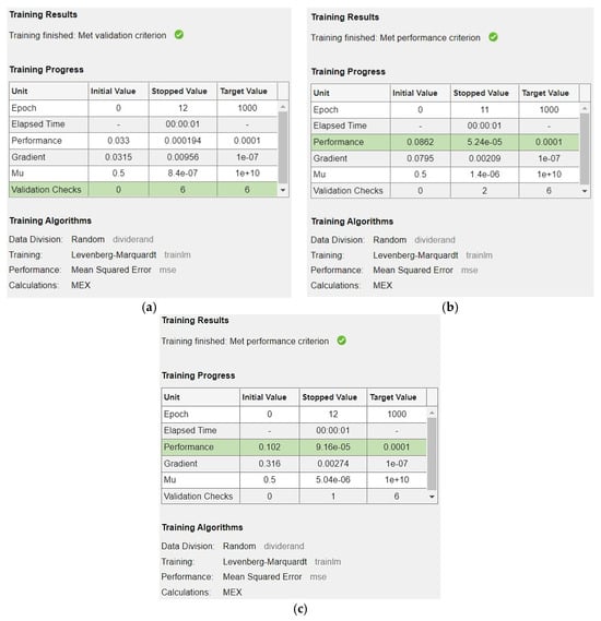 Similarly, the training results of the network are displayed in Figure 7, which shows which criteria have been met first and stopped the training process. It also shows how many iterations/epochs were completed while training the network. All of these stopping criteria are mentioned in the model creation procedure.