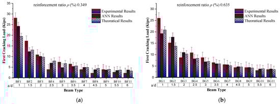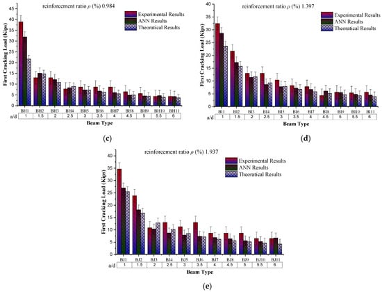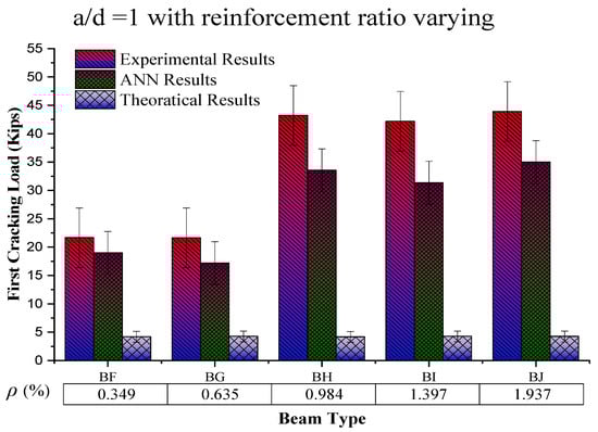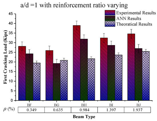 The constant value of the shear span to the effective depth ratio (a/d = 1) with an increasing reinforcement ratio (%) (from the graph in Figure 9) shows an increasing trend at up to 0.984% reinforcement ratio, which then decreases among the beam samples, while for the same sample value of experimental results, ANN results and theoretical results go on a decreasing trend, respectively. The possible reason for this increasing behaviour of first cracking load with increasing ρ (%) is the steel strength and the bond of concrete with steel, because during this condition, steel yields first and then concrete, which results in increased the load-carrying capacity of the beam. On the other hand, a further increase in the reinforcement ratio caused by reinforced beams results in brittle failure, causing a decrease in the beam’s load-carrying capacity.
