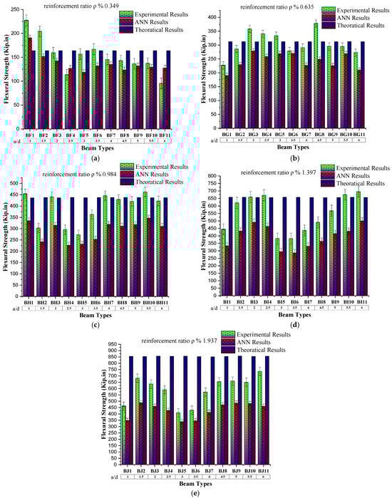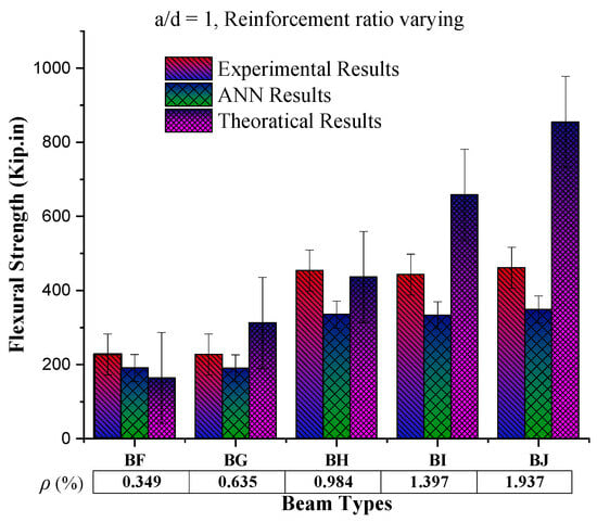 To check the effect of reinforcement on the beam by keeping the shear span effective depth ratio (a/d) constant, the experimental results (as scene in Figure 11) show an increase in flexural strength up to the reinforcement ratio 0.984%, which later shows the marginal change in flexural strength. At the same time, the ANN-predicted results against these input parameters show the same trend with increasing reinforcement. Furthermore, ANN-predicted results are close to the experimental results, which enables the applicability of the ANN model for the flexural strength or ultimate load prediction of the reinforced concrete member.