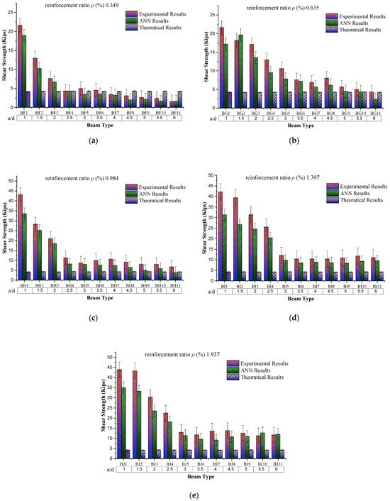 Beam sample group division is based on the reinforcement ratio, which varies from 0.349 to 1.937. In contrast, the shear span/depth ratio increases from 1 to 6 with an increment of 0.5 in each sample group. The behaviour of shear strength with the increasing shear span to adequate depth (a/d) ratio while keeping the reinforcement ratio constant to 0.349% shows a decreasing trend (as shown in Figure 12). From the experimental results for the “a/d = 1”, the shear strength is 21.64 kip, while for “a/d = 6”, this shear value is reduced to 1.52 kip. The possible reason for this decreasing trend is the increase in the span length of the beam with increasing shear span/depth ratio because of the constant value of “d”. When comparing the experimental results, the ANN and theoretical results also show a decreasing trend for the same sample. The decrease in experimental results from theoretical results may be due to an increase in the beam’s span length, resulting in the reduction of load-carrying capacity. The same trend is observed in all sample groups, as shown in the graphs.