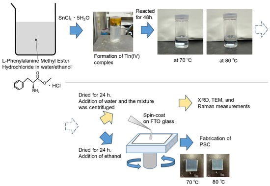 All chemicals were used as purchased. L-phenylalanine methyl ester hydrochloride (C6H5CH2CH(NH2)COOCH3·HCl) and tin(IV) chloride dihydrate (SnCl4·5H2O, >98.0%) were obtained from FUJIFILM Wako Pure Chemical Corporation. Ethanol (99.5%) was purchased from Kanto Chemical Co., Inc., Tokyo, Japan. H2O (resistivity: 18.2 MΩ·cm) was obtained from a Milli-Q® integral water purification system (MERCK Ltd., Tokyo, Japan).