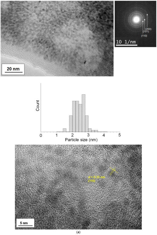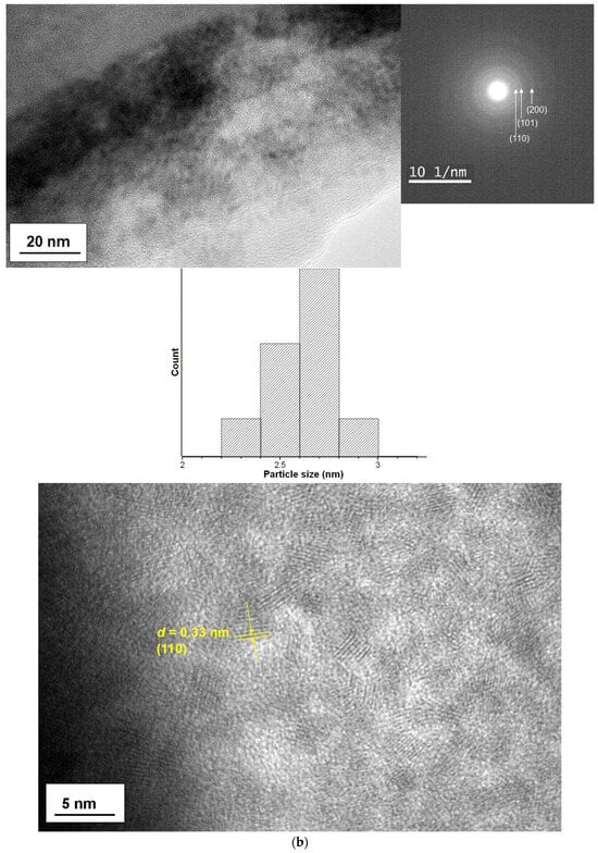 TEM images of as-synthesized SnO2 nanoparticles formed at (a) 70 °C and (b) 80 °C. The size distribution for each sample is also included. A d-spacing of the observed lattice fringes is presented in yellow.