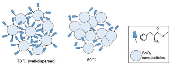 As shown in Figure 1, we synthesized SnO2 nanocrystals by hydrolyzing Sn(IV) in the presence of phenylalanine methyl ester hydrochloride (L) in an aqueous solution of an ethanol/water mixture (for more details, refer to the Materials and Methods section). We were able to simultaneously control both crystal growth and dispersion at temperatures as low as 80 °C. As discussed below, it became evident that reaction temperatures ranging from 70 °C to 80 °C were critical conditions for optimizing the growth of well-dispersed SnO2 nanoparticles. From each reaction mixture at 70 °C and 80 °C, nanoparticles were isolated after drying in ambient air, and an XRD analysis was also conducted on them, as shown in Figure 2. In both samples, several broad peaks were observed, and all of them were assigned to those of the tetragonal SnO2 phases (PDF: 41-1445).