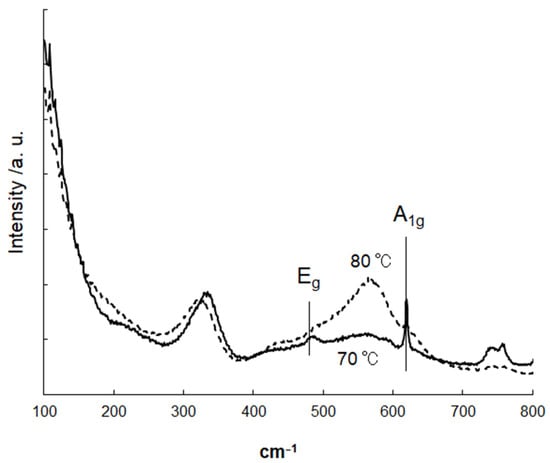 The Raman spectra were also measured after the removal of organic ligands, as illustrated in Figure 6. Interestingly, two broad peaks were observed at approximately 330 cm−1 and 570 cm−1 for both 70 °C and 80 °C samples, which are not commonly seen in bulk single crystals or polycrystalline samples []. The 70 °C sample clearly displayed peaks at 476 cm−1 and 620 cm−1, which were assigned to vibration modes of Eg and A1g, the Raman active modes of rutile SnO2, respectively. Similar shoulder peaks at comparable locations were also identified in the 80 °C sample, likely originating from the same two bands. Liu et al. demonstrated that the existence of bridging oxygen vacancies downshifts the A1g from ~635 cm−1 (bulk) to ~618 cm−1 []. These results suggested that the observed sharp peak at 620 cm−1 for the 70 °C sample arose from bridging oxygen vacancies in the SnO2 nanoparticles, whereas the corresponding peak intensity of the 80 °C sample was significantly decreased. Cheng et al. reported on the abovementioned Raman scattering peaks (observed at 330 cm−1 and 570 cm−1) and noted that they are sensitive to crystal surface area; these phonon modes are caused by small crystal size []. A broad, unidentified peak was observed in both SnO2 samples within the range of 400–450 cm−1. It is likely that not only the grain size but also local disorder may have influenced the Raman scattering, potentially resulting in the appearance of new modes in such a nanocrystalline sample [].