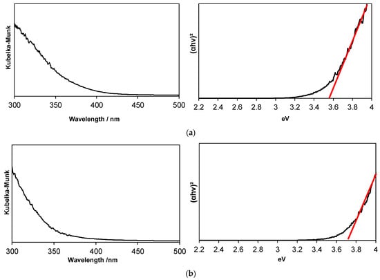 From the diffuse reflectance spectra, the band gaps of the powder samples were estimated to be 3.6 eV and 3.7 eV for the 70 °C and 80 °C samples, respectively (see Figure 7). These values are consistent with previously reported data [].