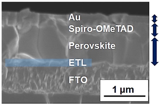 A cross-sectional SEM image of the PSC, consisting of the 80 °C SnO2 sample, is presented in Figure 8. SnO2-based thin films were deposited on top of an FTO substrate using an ethanol-based nanoparticle solution combined with a TiO2 coating layer (see Materials and Methods section). We anticipated that the TiO2 layer could improve electron transport efficiency due to the cascade energy-level shift from the TiO2 to the SnO2 nanoparticle layer. This coating layer may also be effective in suppressing recombination at the surface of the smaller SnO2 nanoparticles. The thickness of the ETL section was found to be approximately 100~150 nm. The large grain size of the perovskite compound, characteristic of high-efficiency PSCs, was also confirmed in the image.