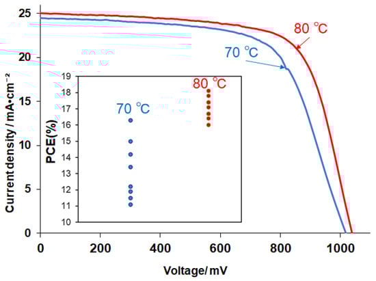 Our primary focus was on the reaction-temperature-dependent performance of SnO2-based ETL in PSCs. To make a fair comparison, we evaluated two SnO2 devices that differed only in the SnO2 materials, as illustrated in Figure 9. In this figure, we present data for each of the best-performing devices, with 70 °C or 80 °C SnO2 as an ETL material. The 80 °C device produced a short-circuit current density (Jsc) of 25.0 mA/cm2, an open-circuit voltage (Voc) of 1050 mV, a fill factor (FF) of 0.69, and a PCE of 18.1%, respectively. We found a marked improvement in efficiency for the 80 °C device compared to the 70 °C SnO2 sample: a Jsc of 22.5 mA/cm2, a Voc of 1020 mV, an FF of 0.65, and a PCE of 16.2%. We also obtained a narrower distribution of the PCE for the 80 °C devices, in which 7~8 cells for each type were measured. The data indicated that the 80 °C devices showed a higher PCE and better reproducibility than the 70 °C devices. It appears likely that the self-assembly of small SnO2 nanoparticles, as observed using TEM for the 80 °C sample, is one of the key factors for achieving a high PCE. The relatively low Voc and FF may have been due to defects in the perovskite layer [], which was not optimized in this study.