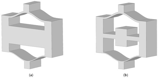 Figure 1a shows a typical negative-stiffness lattice structure (NSLS) composed of upper and lower layers forming a unit cell. Building on the design concept of local resonant metamaterials, a lattice–beam–core structure as shown in Figure 1b is proposed on the basis of the traditional negative-stiffness lattice structure. The newly proposed structure, named meta-NSLS, differs from the previous lattice structure in that the central beam is modified to be cross-shaped. Drawing from the added periodic design of the internal core and the inherent periodic nature of the lattice structure, it is expected to generate a coupling effect, thereby achieving broadband vibration reduction.