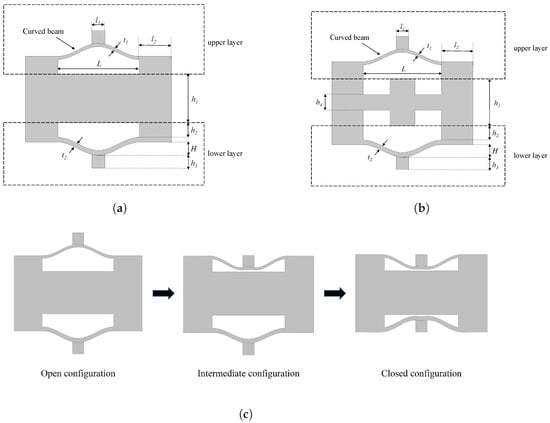Figure 3a,b show the schematic diagram of the unit cell for two different configurations. The most crucial parameters of the model, such as in-plane thickness of the upper curved beam (), in-plane thickness of the lower curved beam (), the height of vertex (H), and the span (L), are set according to the principles mentioned above.