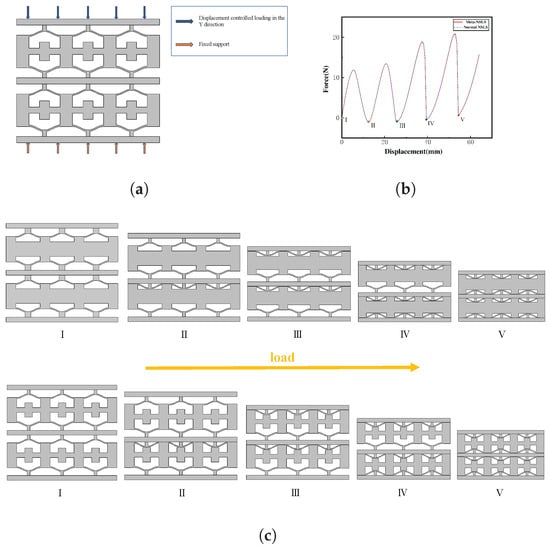 Table 1 displays the geometric parameters for each component. In order to induce a change in state, a uniaxial load is applied vertically to the top. Taking the normal NSLS as an example (the deformation process of meta-NSLS is similar to it), its deformation process under a vertical load is illustrated in Figure 3c. These three typical deformation states can be referred to as the open configuration, intermediate configuration, and closed configuration.