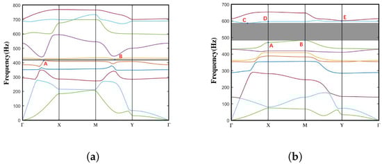 Dispersion curve in the open state of the (a) normal NSLS and (b) meta-NSLS. Several typical eigenmodes of the normal NSLS (Frequencies A–B in Figure 6a) and meta-NSLS (Frequencies A–E in Figure 6b) are captured at the bandgap edges and visualized in Figure 7 and Figure 8 for deeper discussion on the bandgap mechanism. There are ten branches in the energy band structure curve we calculated, the first branch is the acoustic transverse branch, the second branch is the acoustic longitudinal branch, and the other branches are optical branches, which originate from local resonances within the unit cell and the back-folding (Bragg reflection) of the lower acoustic branches. For better distinction, different dispersion curves are represented by different colors and the bandgap range is shaded in grey.