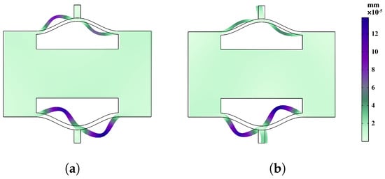 In order to conduct a more in-depth discussion on the bandgap mechanism and explain the reasons for the bandgap, we focus on the bandgap edge frequencies represented as A–B in Figure 6a and A–E in Figure 6b. These specific frequencies provide insights into the behavior of the system at the edges of the bandgap. To visualize the corresponding eigenmodes, we examine the displacement fields captured in Figure 7 and Figure 8. These figures shed light on the spatial distribution of the displacements associated with the selected eigenmodes.