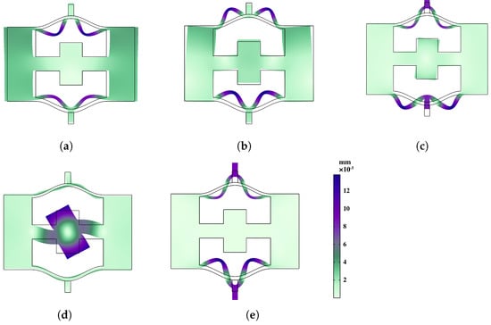 To ensure that the unit cell can exhibit the three states shown in Figure 3c during the compression process, we modeled the NSLS using the geometric parameters selected in Table 2 and explored the deformation performance of the structure. Numerical simulations were performed using COMSOL Multiphysics 5.5 to observe the deformation states and determine the ability of the unit cell to deform in a controlled manner when compressed.