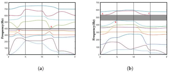 where and represent the frequencies of the upper and lower bandgap edges, respectively. Usually, the band structure of a unit cell consists of numerous branches. In this paper, the energy band structure curve consists of 10 branches.