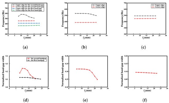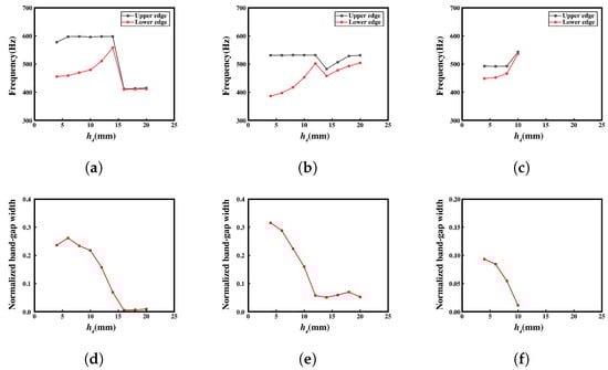 (a–c) Upper and lower edges of the complete bandgap in three different configurations with varying in meta-NSLS. (d–f) Normalized bandgap width for the three different configurations with varying in meta-NSLS.