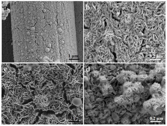SEM images of MoS2/CC-HT synthesized under the different S/Mo molar ratios of: (a,b) 5; (c) 6; (d) 4.