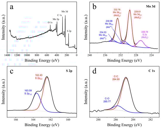 X-ray photoelectron spectroscopy (XPS) is used to analyze the chemical states and surface elemental composition of MoS2/CC-HT. As shown in Figure 3a, the XPS survey spectrum of MoS2/CC-HT, the spectrum exhibits characteristic peaks of Mo 3d, S 2p, C 1s, and O 1s, indicating the existence of MoS2 and carbon in MoS2/CC-HT. The characteristic peaks of O 1s are attributed to the water absorbed on the surface of MoS2/CC-HT. The center, FWHM, and area percentage for the deconvoluted peaks of Mo 3d, S 2p, and C 1s are presented in Tabs. S1 to S3, respectively (Supplementary Materials). Figure 3b shows the XPS high-resolution spectrum of Mo 3d. The peaks at 232.76 and 229.61 eV are related to Mo 3d3/2 and Mo 3d5/2 of Mo4+ in MoS2, respectively [28,29]; the peaks at 234.03 and 230.98 eV assigned to Mo 3d3/2 and Mo 3d5/2 of Mo6+ are related to the Mo-O-C bond between carbon fibers and MoS2 nanosheets [23,30]; the peak at 226.78 eV corresponds to S 2s in MoS2. Figure 3c shows the high-resolution XPS spectrum of S 2p; the separated peaks at 163.59 and 162.40 eV correspond to S 2p1/2 and S 2p3/2 of S2−, respectively [31]. In Figure 3d, the XPS high-resolution spectrum of C 1s exhibited two separated peaks at 284.80 and 285.77 eV, which are assigned to C-C and C-O bonds, respectively [28,32].