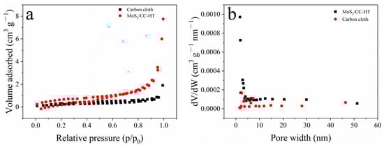 The specific surface area and pore structure analysis of MoS2/CC-HT and the carbon cloth are demonstrated in Figure 5. From Figure 5a, it can be seen that the N2 adsorption–desorption isotherms of MoS2/CC-HT and the carbon cloth belong to Type IV [33]. Calculated with the BET method, the specific surface areas of MoS2/CC-HT and the carbon cloth are 2.41 and 0.86 m2 g−1, respectively [33]. By removing the influence of the carbon cloth, it can be estimated that the specific surface area of MoS2 in MoS2/CC-HT is ~10.16 m2 g−1. From Figure 5b, it can be seen that MoS2/CC-HT has a rich micro-porous structure. The large specific surface area and rich micro-porous structure will increase electrochemical reaction sites and promote the lithium-ion diffusion in the electrode.