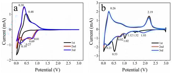 Figure 6a demonstrates the CV curves of the carbon cloth. In the first scanning, the cathode peak around 0.01 V corresponds to Li+ insertion into the carbon cloth and the formation of solid electrolyte interface (SEI) film, and the anode peak at 0.48 V corresponds to Li+ de-insertion in the carbon cloth [34]. In the second scanning, the cathode peaks at 0.01, 0.27, and 0.69 V are related to Li+ insertion of the carbon cloth, and the anode peak at 0.38 V is related to Li+ de-insertion of the carbon cloth. In the third scanning, the cathode peaks at 0.01, 0.19 and 0.81 V can be assigned to Li+ insertion of the carbon cloth, and the anode peak at 0.38 V can be assigned to Li+ de-insertion of the carbon cloth. Figure 6b demonstrates the CV curves of MoS2/CC-HT. In the first cathode scanning, the two cathode peaks appear at 1.52 and 1.02 V, which are attributed to the insertion of Li+ into the MoS2 layer to form LixMoS2 [35]; the cathode peak at 0.53 V is attributed to the formation of an SEI film, accompanied by the decomposition of LixMoS2 to form metal Mo and Li2S [36], whereas the cathode peak at 0.01 V is attributed to the intercalation of Li+ in the carbon cloth. In the first anode scanning, the anode peak at 0.26 V is related to the de-intercalation Li+ in the carbon cloth, while the anode peak at 2.19 V is related to the oxidation process of LiS2 to S and Mo to MoS2 [37]. The CV curves of the second and third cycles almost coincide with each other, indicating that MoS2/CC-HT has good cyclic repeatability. In the second and third scanning, the cathode peak related to the formation of LixMoS2 by the insertion of Li+ in MoS2 layers shifts to 1.93 V; the cathode peak related to the decomposition of LixMoS2 to metallic Mo and Li2S shifts to 1.12 V [38]; the anode peaks at 0.01, 0.21, and 0.82 V can be assigned to the Li+ insertion of the carbon cloth.