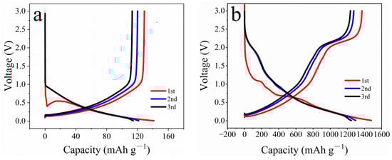 Figure 7a demonstrates the charge–discharge curves of the carbon cloth. The discharge capacities of the carbon cloth are 141, 122, and 114 mAh g−1 in the first three cycles; its charge capacities are 129, 120, and 113 mAh g−1; and its Coulombic efficiencies are 91.5%, 98.4%, and 99.1%. In Figure 7b, the charge–discharge profiles of MoS2/CC-HT and the charge voltage plateau at 2.19 V corresponds to the oxidation of LiS2 to S and Mo to MoS2. The discharge capacities of MoS2/CC-HT are 1478, 1296, and 1245 mAh g−1 in the first three cycles; its charge capacities are 1370, 1274, and 1234 mAh g−1; and its Coulombic efficiencies are 92.7%, 98.3%, and 99.1%.