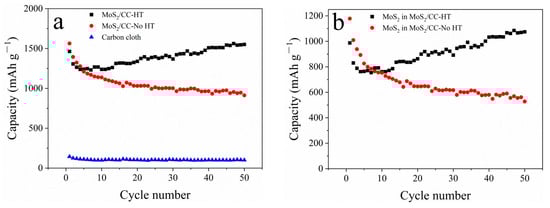 The cyclic performance of MoS2/CC-HT, MoS2/CC-No HT, and the carbon cloth are shown in Figure 8a. The carbon cloth delivers a stable capacity of 110 mAh g−1 during cycling. The capacities of MoS2/CC-HT and MoS2/CC-No HT include the capacity of the carbon cloth and the capacity of MoS2 loaded on the surface of the carbon cloth. Therefore, the capacity of MoS2 in MoS2/CC-No HT and MoS2 in MoS2/CC-No HT (shown in Figure 8b) can be calculated by removing the capacity of the carbon cloth. The capacity of MoS2 in MoS2/CC-HT continuously increases to 1075 mAh g−1 at a current density of 0.1 A g−1 after 50 cycles, while the capacity of MoS2 in MoS2/CC-No HT continuously decreases to 528 mAh g−1. The MoS2 in MoS2/CC No HT is 1T phase, while the MoS2 in MoS2/CC HT is the 2H phase; 2H phase MoS2 has a better capacity retention performance than 1T phase MoS2. Therefore, with heat treatment, MoS2 on the surface of the carbon cloth is transformed from the 1T phase to the 2H phase, resulting in the better capacity retention performance of MoS2/CC-HT.