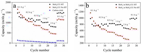 Rate performance: (a) MoS2/CC-HT, MoS2/CC-No HT, and carbon cloth; (b) MoS2 in MoS2/CC-HT and MoS2 in MoS2/CC-No HT.