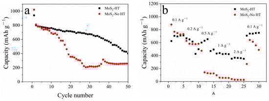 Figure 10 demonstrates the cyclic and rate performance of MoS2-HT and MoS2-No HT powders. From Figure 10a, it can be seen that MoS2-HT powder has a better capacity retention performance than MoS2-No HT powder. MoS2-HT delivers a capacity of 401 mAh g−1, while MoS2-No HT delivers a capacity of 258 mAh g−1 at a current density of 0.1 A g−1 after 50 cycles. During charge–discharge, 1T phase MoS2-No HT undergoes a larger volume change than 2H phase MoS2-HT, which leads to its worse capacity retention performance. From Figure 10b, at the gradually increasing current densities of 0.1, 0.2, 0.5, 1, and 2 A g−1, MoS2-HT delivers the capacities of 709, 616, 601, 427, and 363 mAh g−1, while MoS2-No HT delivers the capacities of 746, 578, 128, 57, and 27 mAh g−1.