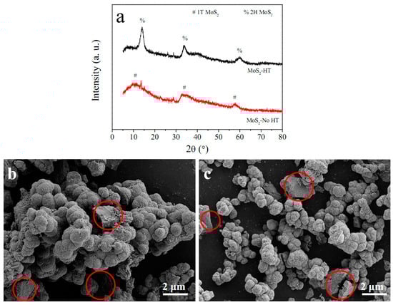 Figure 11a shows the XRD patterns of MoS2-HT and MoS2-No HT powders. It can be seen that MoS2-HT is 2H phase, while MoS2-No HT is 1T phase, indicating that the carbon cloth substrate will not change the phase of the loaded MoS2. Figure 11b,c demonstrate the SEM image of MoS2-No HT and MoS2-HT powder, respectively. Because heat treatment only changes the phase of MoS2, MoS2-No HT powder exhibits the same morphology as MoS2-HT powder. From Figure 11b,c, it can be seen that both MoS2-No HT powder and MoS2-HT powder consist of MoS2 flowers (area outside the red ring in Figure 11b,c) and MoS2 aggregates (area inside the red ring in Figure 11b,c). Because MoS2 in this paper is synthesized by a hydrothermal reaction in an aqueous solution of ammonium molybdate and thiourea, the strong polarity of water inevitably leads to the aggregation of the synthesized MoS2. Large-sized MoS2 aggregates will undergo fragmentation, pulverization, and detachment during the charge–discharge, resulting in their capacity fading. The carbon cloth substrate causes the loaded MoS2 to form a mutually separated nanosheet array. The non-agglomerated MoS2 nanosheet array will increase electrochemical reaction sites and promote the diffusion of lithium ions in the electrode. Thus, MoS2/CC-HT delivers higher capacity than MoS2-HT, while MoS2/CC-No HT delivers higher capacity than MoS2-No HT.
