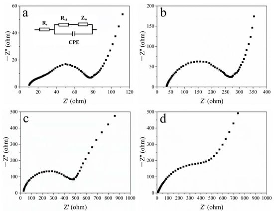 Figure 12 presents the EIS patterns of MoS2/CC-HT, MoS2/CC-No HT, MoS2-HT, and MoS2-No HT. In the mid-frequency region, the diameter of the semicircle in the Nyquist plot is related to the charge transfer resistance of the electrode [39,40]. The larger semicircle diameter means the larger charge transfer resistance of the electrode. The charge transfer resistances of MoS2/CC-HT, MoS2/CC-No HT, MoS2-HT, and MoS2-No HT are 60.2, 245.6, 466.8, and 575.5 Ω, respectively. The carbon cloth has good conductivity. The conductivity of the loaded MoS2 nanosheets can be enhanced by the carbon cloth substrate, thereby reducing their charge transfer resistance. In the low-frequency region, the slope of the oblique line in the Nyquist plot is related to the diffusion rate of lithium ions in the electrode. The steeper the slope of the oblique line, the faster the rate of diffusion of lithium ions into the electrode [41]. Apparently, the diffusion rate of lithium ions in MoS2/CC-HT is faster than that in MoS2-HT, and the diffusion rate of lithium ions in MoS2/CC-No HT is faster than that in MoS2-No HT. The mutually separated MoS2 nanosheets grown on the surface of the carbon cloth will promote the diffusion of lithium ions in the electrode.