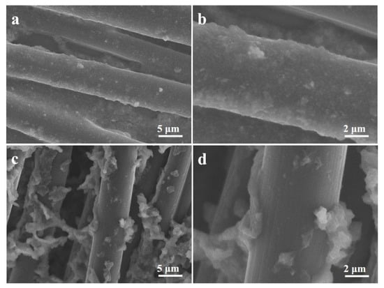 Figure 13a,b provide the SEM images of MoS2/CC-HT after 50 cycles at a current density of 0.1 A g−1. The MoS2 layer still firmly adhered to the surface of the carbon cloth without shedding. In contrast, for MoS2/CC-No HT after cycling, a large amount of detachment occurred in the MoS2 layer (Figure 13c,d). This is the reason why MoS2/CC-HT has a better capacity retention performance than MoS2/CC-No HT.