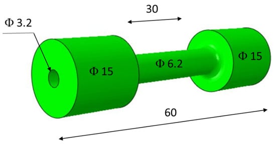 The average relative density of the samples measured using the Archimedes method was 99.93% ± 0.04. Cylindrical specimens with a length of 60 mm were used for thermal fatigue testing. The measuring part of the specimen was 30 mm long and 6.2 mm in diameter. Along the axis of the specimen, there was a hole with a diameter of 3.2 mm. The shape and dimensions of the thermal fatigue test specimen are shown in Figure 1.