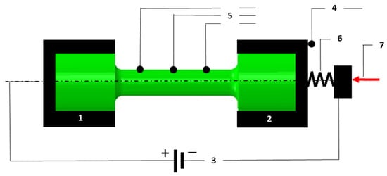 Schematic of thermal fatigue test stand: 1—stationary clamp; 2—moving clamp; 3—current supply; 4—displacement sensor; 5—temperature measurement system; 6—element of constant stiffness; and 7—actuator regulating the clamping force acting on component “6”.