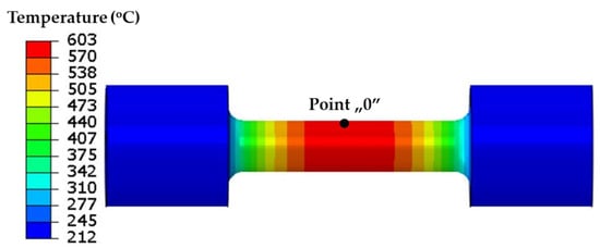 Figure 3 shows the symmetry of the temperature field and the change in the temperature values occurring along the axis of the sample, which was caused by the cooling of the grips in which the sample was mounted. The temperature changes in the surface during the heating and cooling phases of the sample at the “0” point (Figure 3) and at points symmetrically located at distances of 2, 4, 6, 8, 10, and 12 mm from the “0” point are shown in Figure 4.