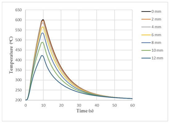 Temperature changes in surface of sample model at point “0” and at points 2, 4, 6, 8, 10, and 12 mm away from it.