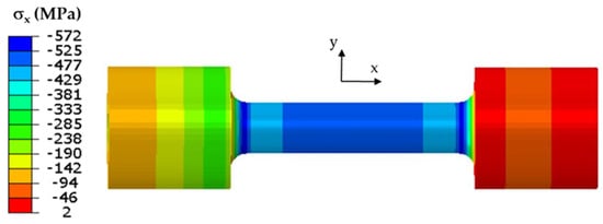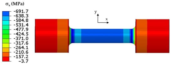 The classic Coffin test assumes no displacement of either end of each specimen. Cyclic temperature changes in a specimen induce stresses. The stress and strain values in the specimen model were determined from the temperature changes in the model that were described above. The field of maximum axial stress values σx at the end of the resistance-heating phase when the temperature at the “0” point (Figure 3) was 600 °C is shown in Figure 5.