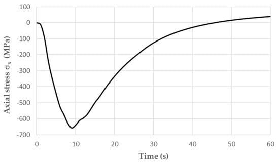 When the temperature reached 600 °C in the middle part of the specimen, compressive stresses σx of about −670 MPa dominated. The remaining circumferential and radial stress components did not exceed 20 MPa. As the temperature decreased, the compressive stresses also decreased; by the end of the cycle, they changed to positive figures, and the centre of the specimen was tensile (Figure 6). The maximum tensile stress in the fatigue cycle was σx = 40 MPa.