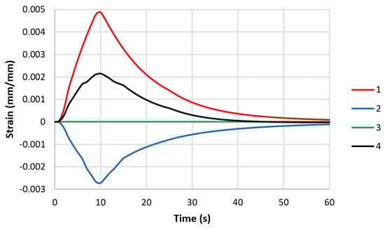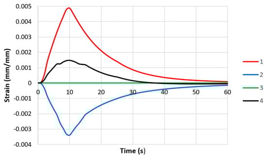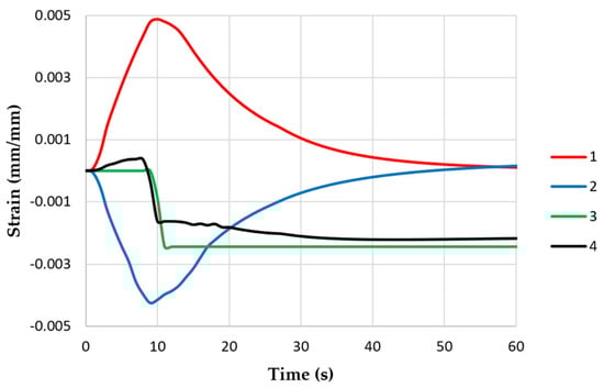 Changes in strain values in middle parts of specimen models with controlled clamping stiffnesses: 1—thermal strain εΤ; 2—elastic strain εe; 3—plastic strain εpl; and 4—total strain εtot (maximum displacement—0.057 mm).
