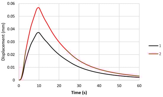 Using the numerical model, the states of the stress and strain in the specimen were determined for two different specimen clamping stiffnesses. An indirect measure of the stiffnesses in the analysed models was the value of the displacements of the ends of the specimens, which could be compared with the displacements that were recorded during the experimental testing. The changes in the displacements of the ends of the specimens for the two numerical models that were analysed are shown in Figure 8. During the experimental tests, the maximum displacements of the ends of the specimens were 0.037 and 0.057 mm.